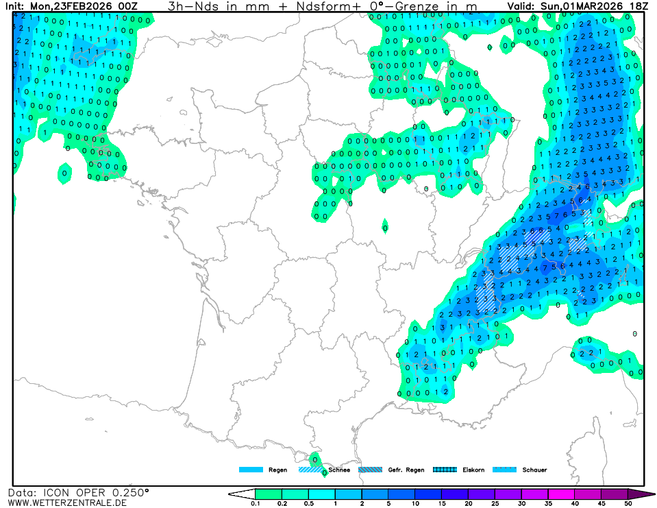 De 3 HEURES en 3 HEURES NUAGES: GRIS =30% BLANC = >90% - PLUIE = COULEUR NEIGE=
